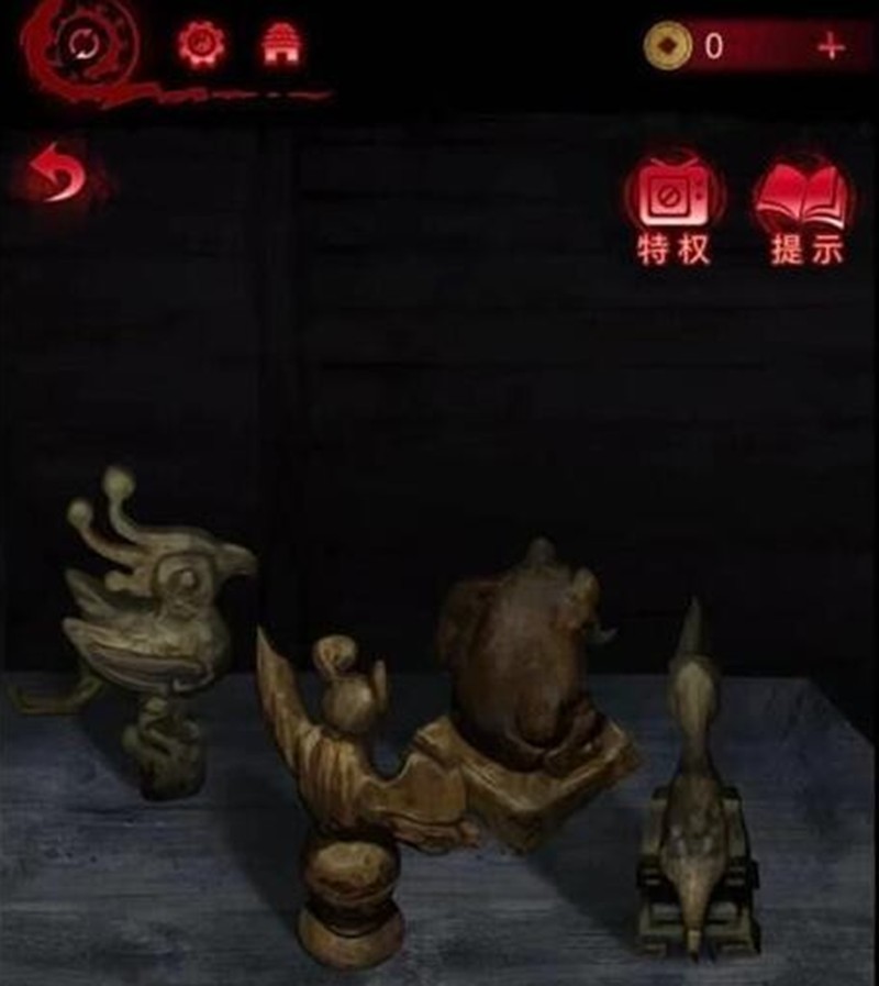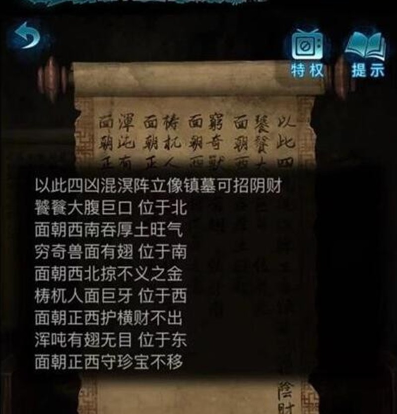 将钱币和小铜船放在左侧箱子上,根据线索可获得洿泽木雕和心形木雕。将心形木雕交给老肖后,放置在古墓中间的杆子上能获得物欲愿。按照纸条提示上香,完成后收回木雕并点击铜镜,可以获得红尘愿。