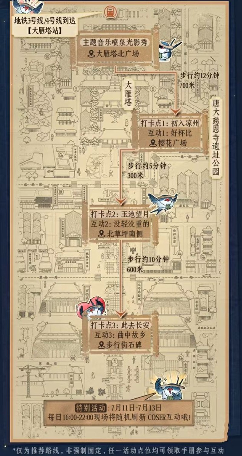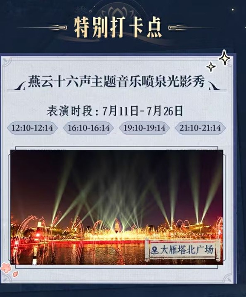 活动时间定于2025年7月11日至7月26日。在这期间,侠客们可以前往雁塔北广场欣赏《燕云十六声》主题曲音乐喷泉表演,感受游戏与现实交融的独特魅力。