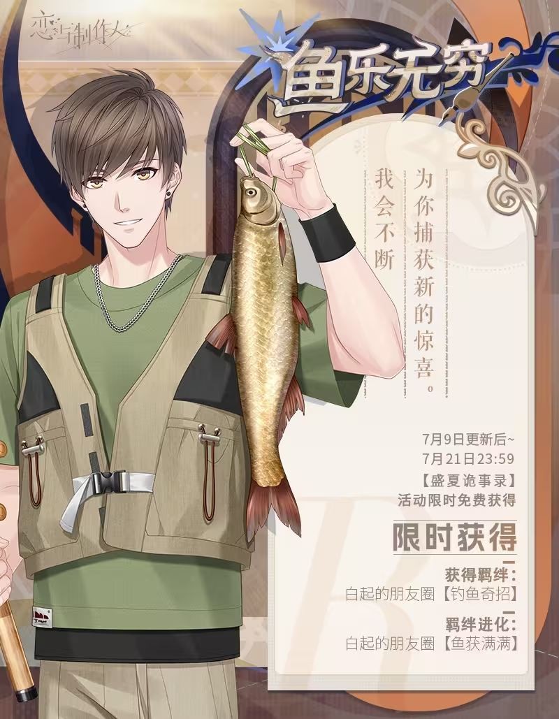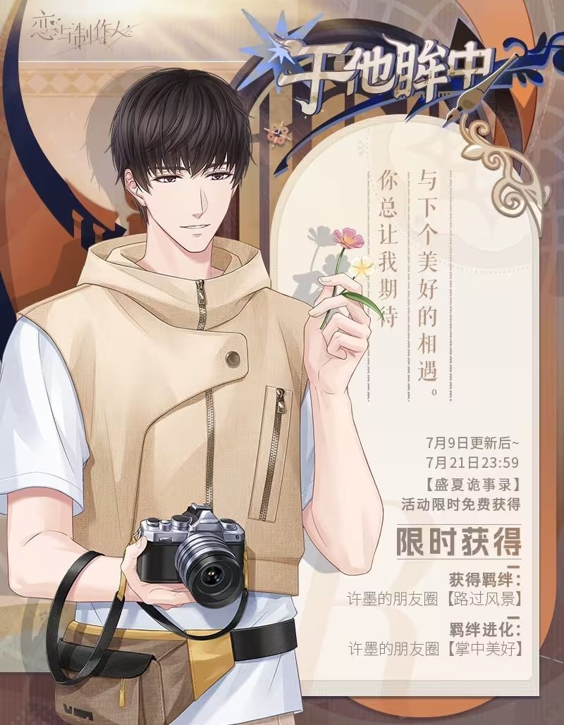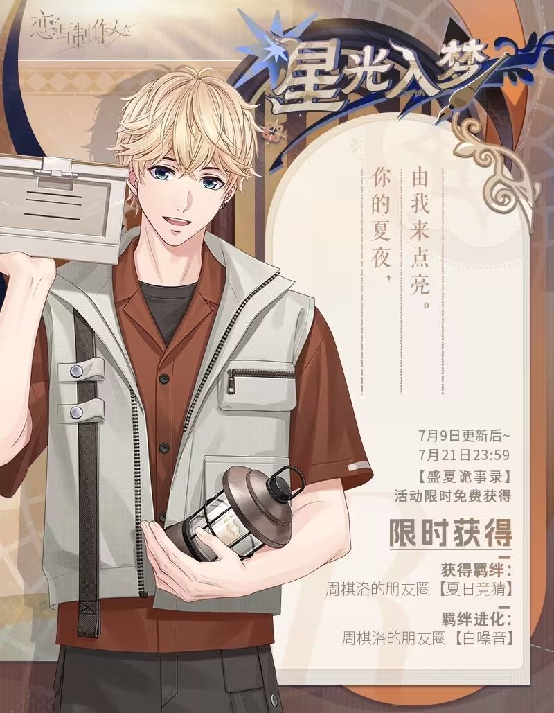 恋与制作人的“盛夏诡事录”活动将于7月9日更新后正式开启,持续至7月21日23:59。在这次活动中,制作人可以与角色一同前往度假庄园纳凉,寻找奇闻轶事,解锁多重趣味体验。