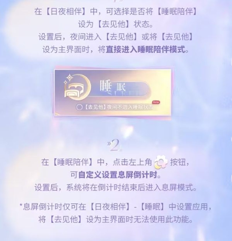 1.在【日夜相伴】中,可选择是否将【睡眠】设为【去见他】状态。设置后,夜间进入【去见他】或将【去见他】设为主界面时,将直接进入睡眠陪伴模式。