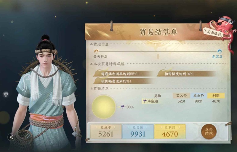 航线:刺桐港(福州沙糖)→替天行岛(海寇旗)→龙荔岛(汴京磨喝乐×3、明州小木船×3)→刺桐港(福州沙糖)