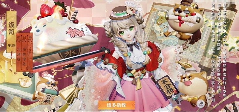 在造型上我们可以看见,「悠享肴香」以美食为主题,饭笥身着粉色的连衣裙,裙摆缀满各种甜点和曲奇,仿佛一位从童话中走出的美食鉴赏家,皮肤的特效设计充满了美食元素,技能释放时会有甜点和香气弥漫的效果,细节之处尽显精致。