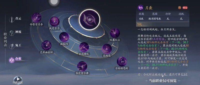 合欢职业的核心机制是伴影值系统。伴影值需要通过基础技能攻击来积累,当积满100点后可以释放比翼红尘技能进入爆发状态。在基础状态下,合欢的月袭技能没有冷却时间,连续使用可以触发位移和额外伤害效果。觅相思技能可以释放刃轮造成减速效果,再次点击可以快速位移到刃轮位置。