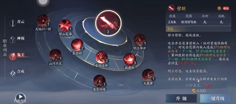 鬼王的普通攻击看似简单,实则暗藏爆发力。疯魔斩作为核心起手技能,兼具范围伤害与聚怪效果,能将敌人拉至身前。索魂追命提供灵活的位移能力,配合下落攻击可打出高额伤害。震岳劫是鬼王的核心控制技,能将周围敌人震飞至空中。劈山震海需要短暂蓄力,可造成多段高额伤害。