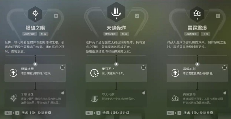 大招天谴轰炸的升级分两个阶段。第一次升级选择多重打击增加轰炸点数量,第二次升级选择炼狱焦土扩大轰炸范围。使用时要注意预判敌人位置,在空地直接覆盖中心区域,在房区则封锁门窗位置。
