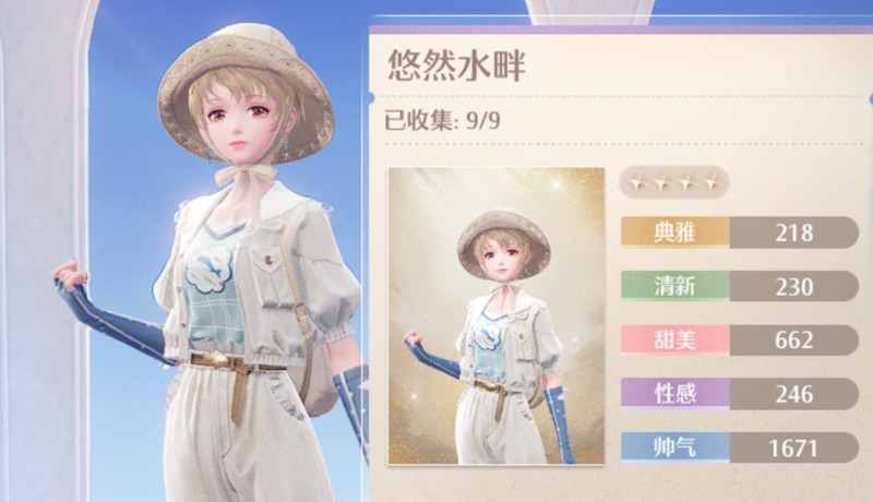 这套时装的属性数值分别为:典雅218、清新230、甜美662、性感246、帅气1671。获得悠然水畔后,玩家可以在水域附近进行钓鱼玩法,收集手绢鱼等基础材料。这些材料可以用来兑换更多精美时装。