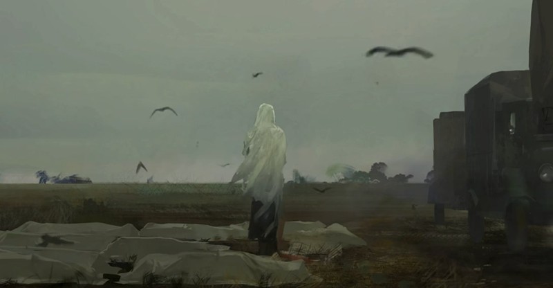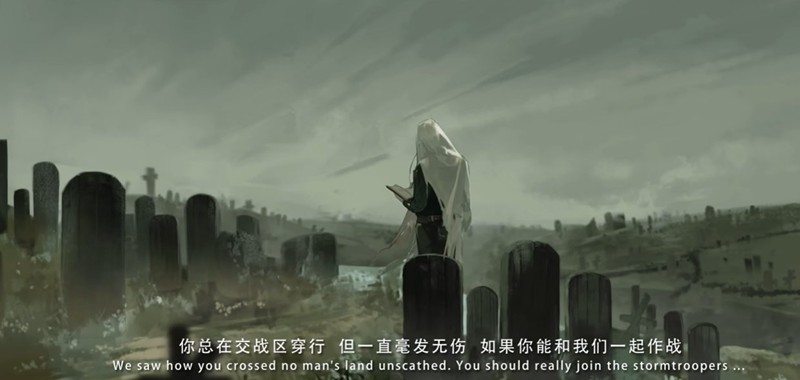 我们可以看见,整支PV以黑白与暗红为主色调,卡戎独自穿行在炮火洗礼后的焦土,为阵亡者合上双眼、低声祷告,“他独行于焦土尽头,背负着所有战场的记忆,也托起所有亡魂的叹息。”