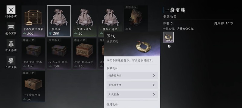 燕云十六声的货币种类较多,周元通宝是前期最重要的货币,用于技能升级和装备强化。在清河地区完成任务和探索能获得大量通宝。其他货币随着游戏进程会逐渐熟悉用途,同时通宝是可以转换的。在很长时间宋元通宝非常重要,小伙伴们可以每周转换宋元通宝,后期才不至于没有钱花~