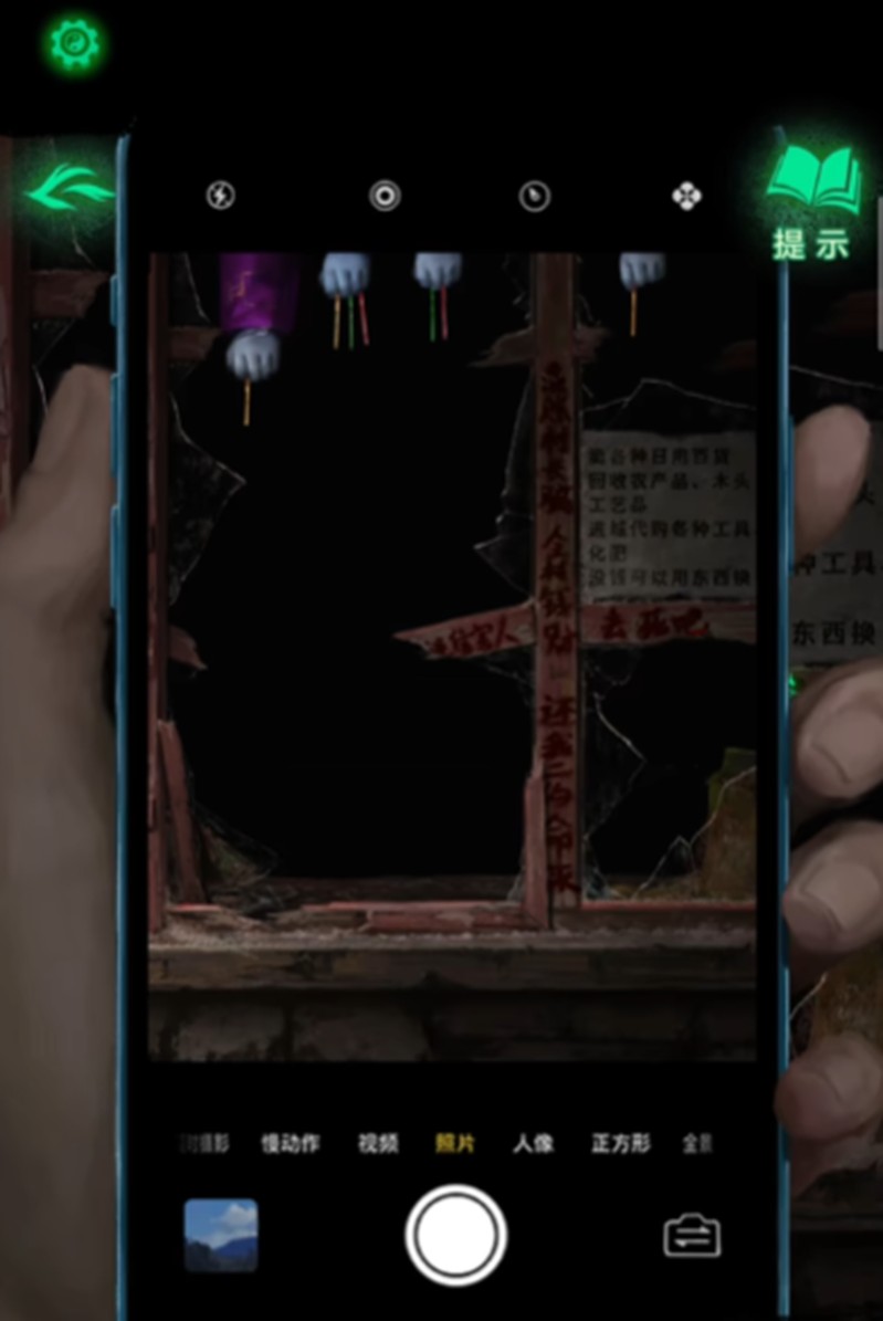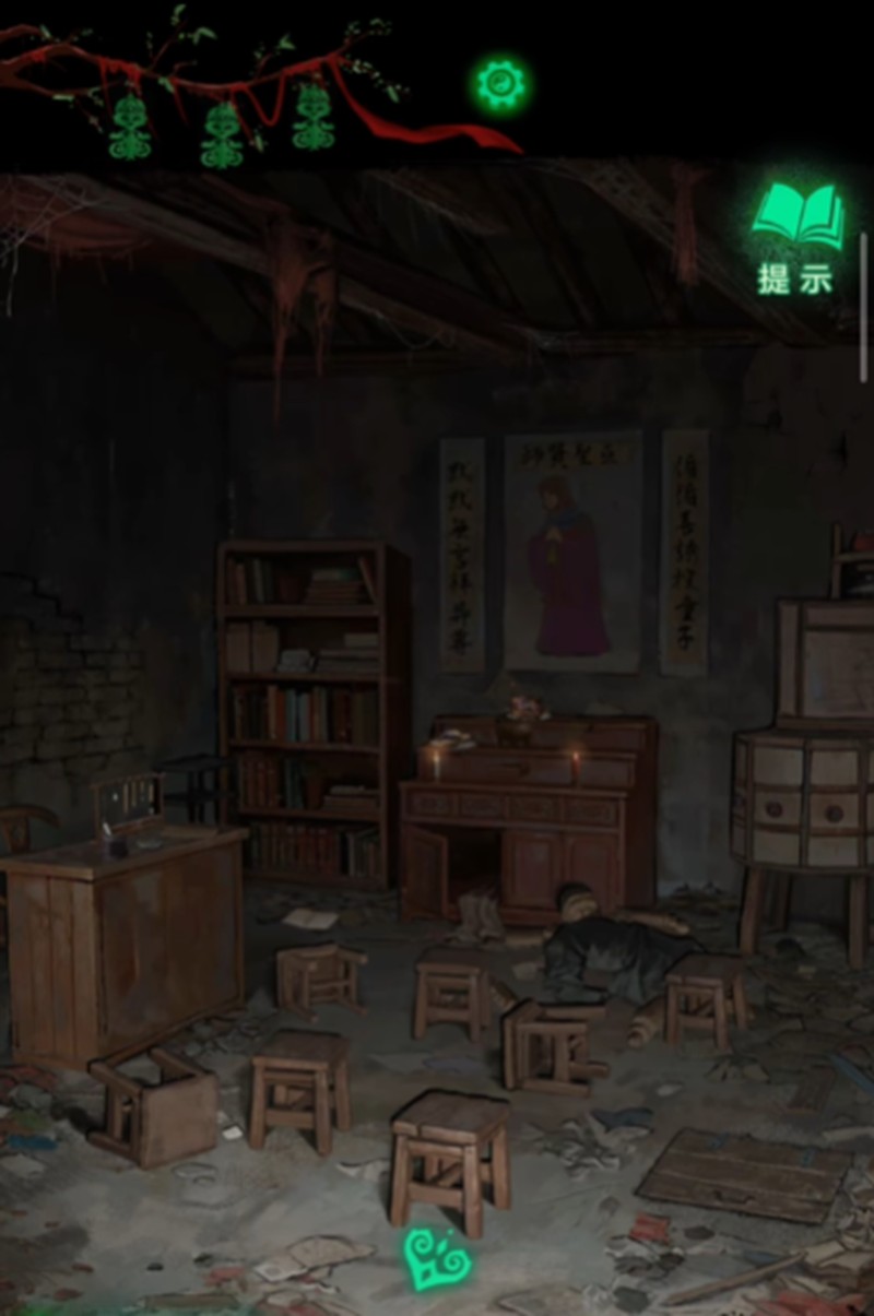 离开民居后,在村口石碑处嵌入石片,根据笔画线索点击石块就能开启学堂门。进入学堂与木偶手互动,用玩具手枪可以换到直尺。利用直尺从另一个房间的墙缝中挑出红绳,回到学堂将红绳用于西洋镜,查看西洋镜获取重要线索。