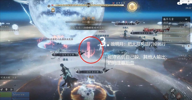 2.故月明技能:boss能量条满后,会出护盾机制,中间会出现一个巨大月亮,立即转火大月亮打掉(血很厚,并且该阶段需要注意,不要踩到地上掉落的破碎紫月亮,踩到会给大月亮回血),能打多少算多少,尽量减轻奶妈压力,最后会结算剩余血量造成全团aoe伤害。