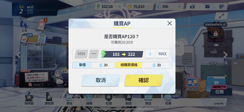 在蔚蓝档案中,每挑战一个主线或支线关卡都需要消耗10点体力。如果挑战失败,系统会将消耗的体力返还给玩家。最基础的体力恢复方式是随时间自然回复,每隔一段时间系统就会自动补充一定量的体力值。