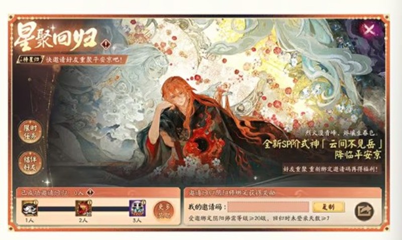 单个邀请绑定码最多可绑定3名星聚回归·星重聚的阴阳师大人,一名重返平安京的阴阳师大人仅可被一个邀请码绑定。