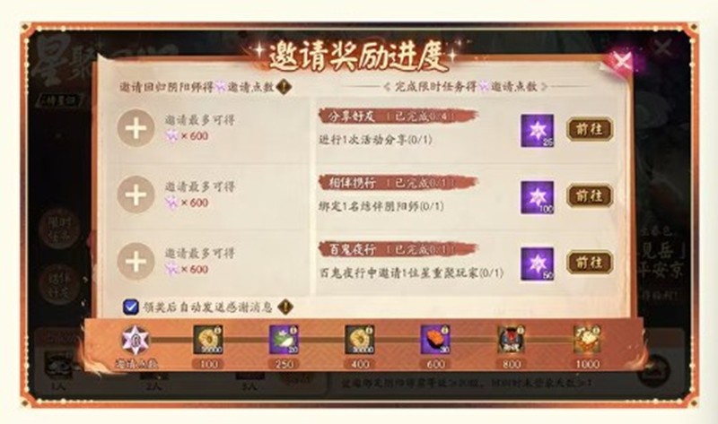 活动期间20级的大人将开启星聚回归·待星归活动阴阳师大人可通过成功邀请人数领取相应邀请奖励