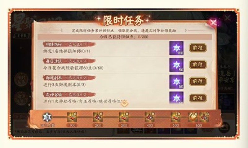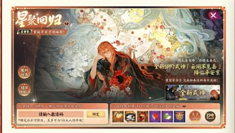 活动期间参与星聚回归·待星归活动的阴阳师大人将获得唯一邀请绑定码,可与7日内未进行过游戏登录,以及参与星聚回归·星重案活动的阴阳师大人绑定领取相应邀请奖励与更多回归点奖励。