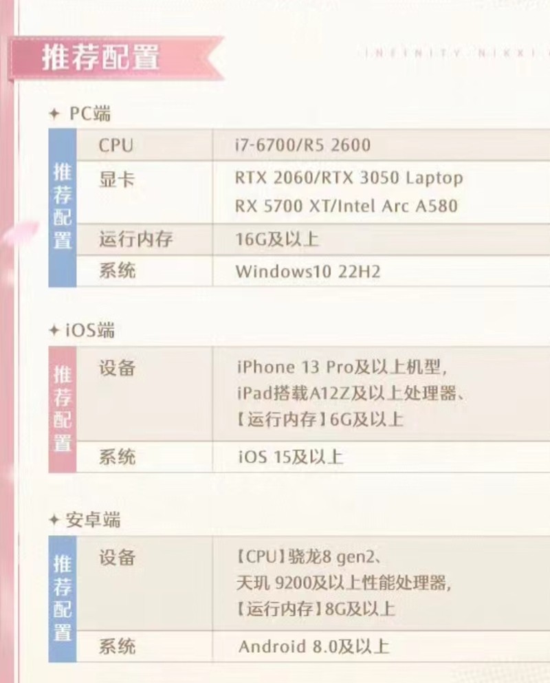 以上就是无限暖暖的配置需求介绍了。想要畅玩这款精美换装手游,建议玩家们根据自身设备情况选择合适的运行平台。