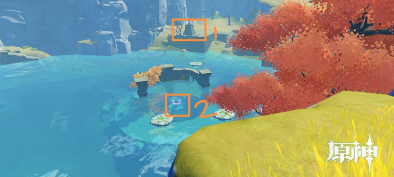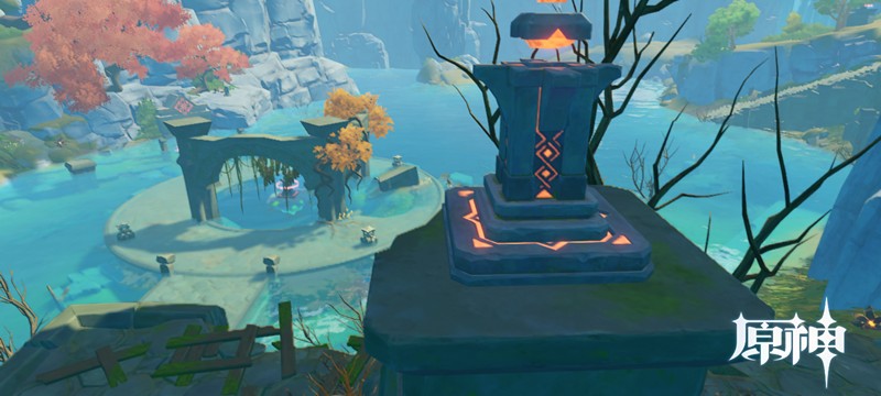来到湖中央后需要解锁第二个机关。这个机关需要点亮三个导光装置,每个装置都需要携带星标能量才能激活。在机关周围可以找到特殊的矿石,击碎后会掉落星标。携带星标靠近导光装置就能完成点亮,但要注意星标有时间限制,超过时间就会消失。