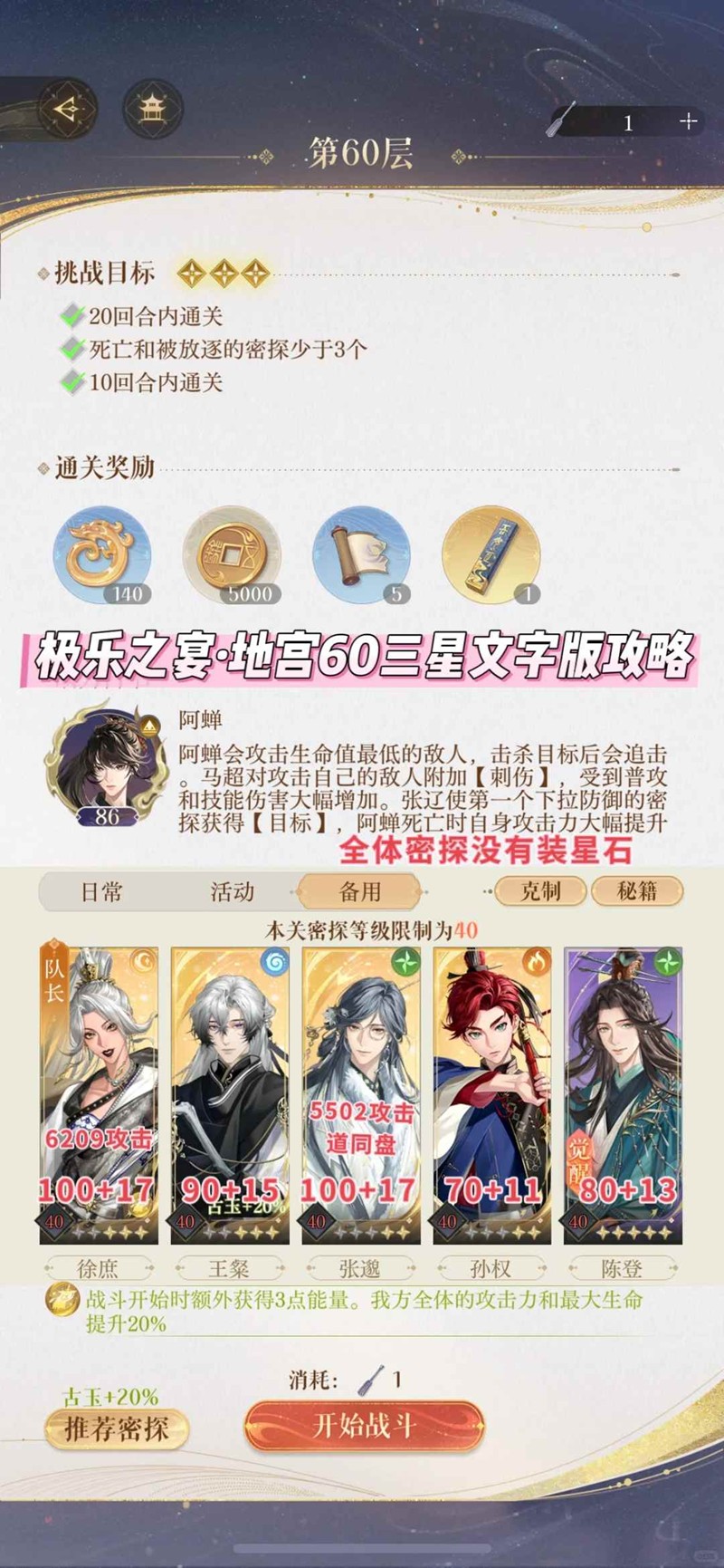 如鸢游戏以策略卡牌和沉浸式剧情为核心玩法,共有傅融、刘辩、袁基、左慈、孙策五位男主,玩家只需完成指定任务和剧情对话就能快速通关。每一位男主按顺序会开启地宫玩法,本次地宫是刘辩极乐之宴地宫,那么地宫60如何三星通关呢?小编为你准备了一份攻略,一起来看看吧~