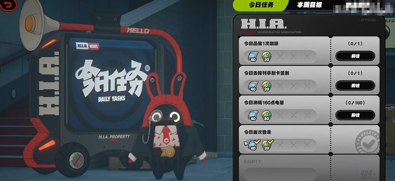 找到"好仔"后,与其进行对话互动就能打开任务界面。在"今日任务"选项中可以看到当天发布的四种委托任务。这些任务包括登录游戏、品尝咖啡、报亭刮卡以及消耗160电量。这些任务内容每天基本固定,完成难度都不高。
