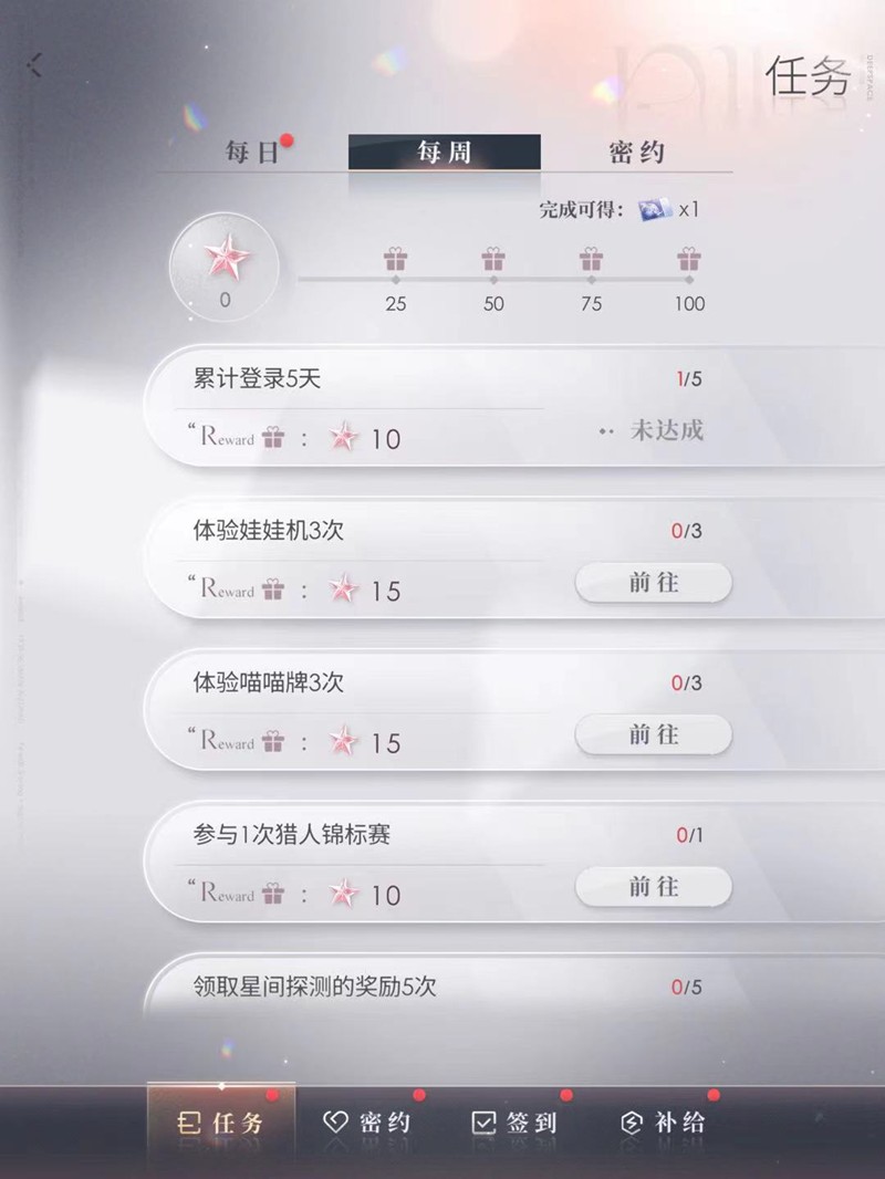完成每周任务是稳定获取极空许愿券的主要方式之一。玩家只需完成指定任务达到100活跃度,就能获得一张蓝票。这些任务包括连续登录、体验娃娃机小游戏等日常活动,难度不高但收益稳定。游戏更新维护后通常也会发放补偿奖励,其中就包含极空许愿券。
