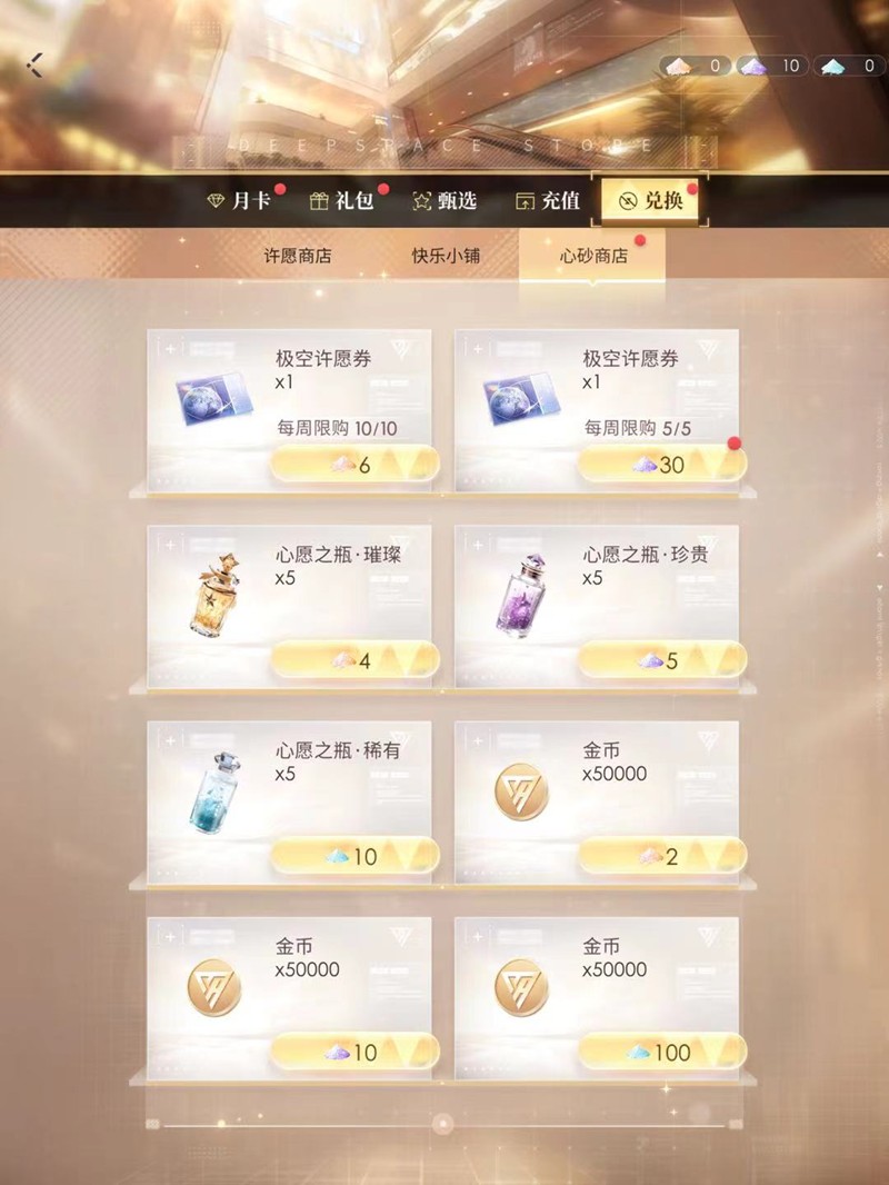 重复抽卡获得的心砂可以在商城中兑换极空许愿券。6个金色心砂或30个紫色心砂都能兑换一张蓝票,不过要注意每周的兑换上限。建议玩家及时兑换溢出的心砂资源,避免浪费。
