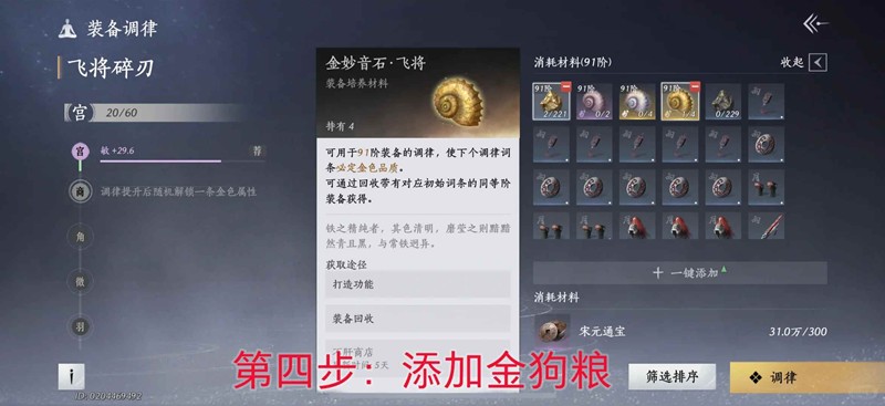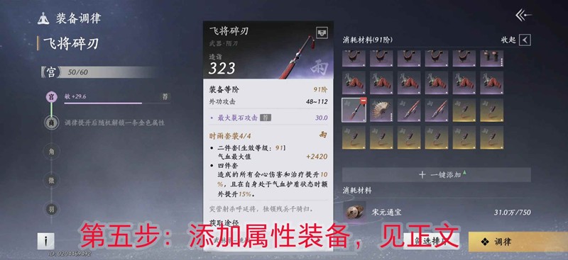 回到需要调律的装备,点击【一键添加】,删除律石至【左侧进度条一半】,添加【金狗粮】,添加【属性装备】。