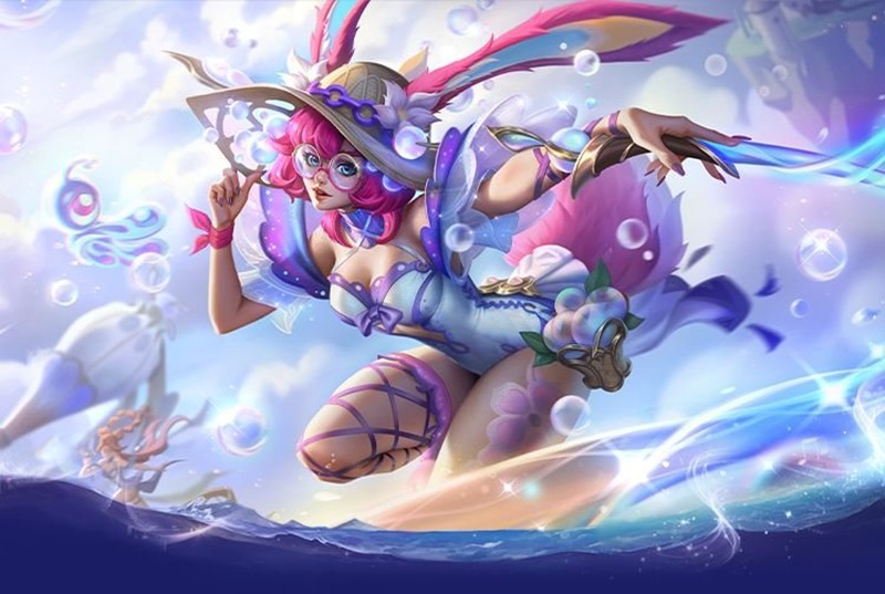 阿萝拉召唤蓝紫色的强力气流攻击敌人的同时把自己向后吹飞,气流席卷之处还会残留些许粉色泡泡,被命中的敌人将受到魔法伤害并减速。
