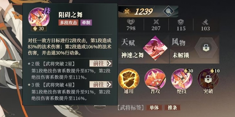随着突破等级的提升,乔菱的技能效果会不断增强。2星突破时,阻碍之舞的第一段伤害提升至87%,第二段提升至111%。4星突破后,第一段伤害达到91%,第二段更是提升到116%的伤害系数。这样的输出能力在蓝卡武将中相当突出。