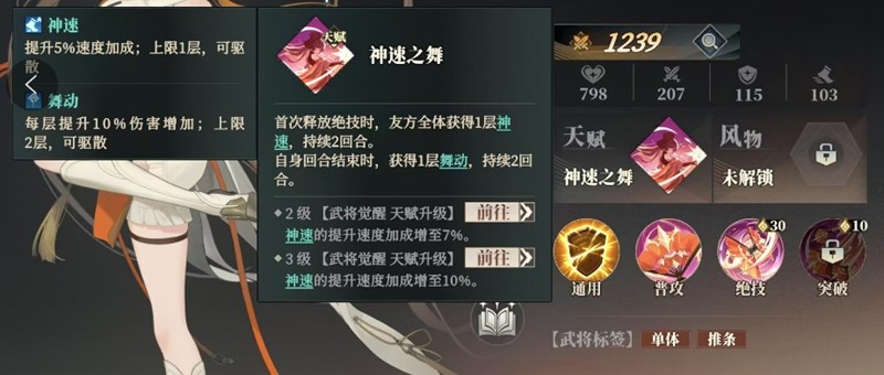 乔菱的天赋神速之舞在首次释放绝技时,能为全体友军提供持续2回合的速度加成。初始加成5%,随着天赋等级的提升,这个加成最高能达到10%。这个天赋让乔菱在后期战斗中能帮助队伍更快出手,占据战斗先机。