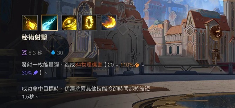 一技能秘术射击是EZ的主要输出手段。这个技能不仅伤害可观,更重要的是命中后能减少其他技能的冷却时间。后期配合装备的冷却缩减属性,可以让EZ实现近乎无限的风筝能力。特别是搭配冰拳这件装备时,EZ的poke能力会达到极致。