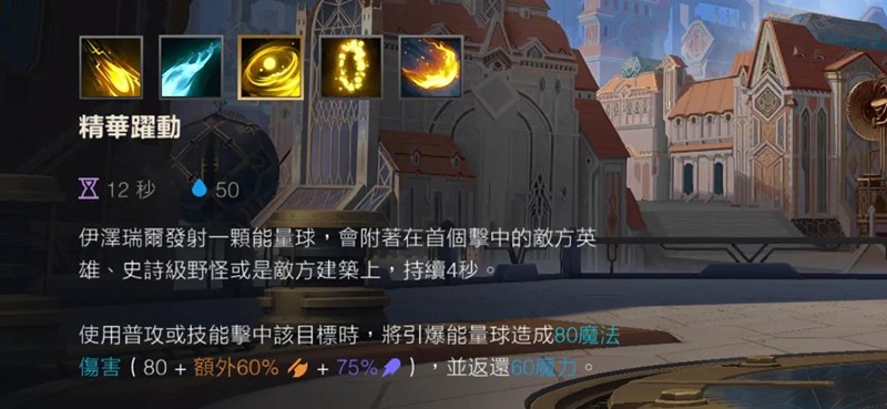 二技能精华跃动是EZ的续航保障。在手游没有血瓶购买的情况下,这个技能提供的回蓝效果显得尤为重要。通过技能命中后的普攻回蓝机制,EZ可以很好地解决蓝耗问题,保持线上的持续压制力。