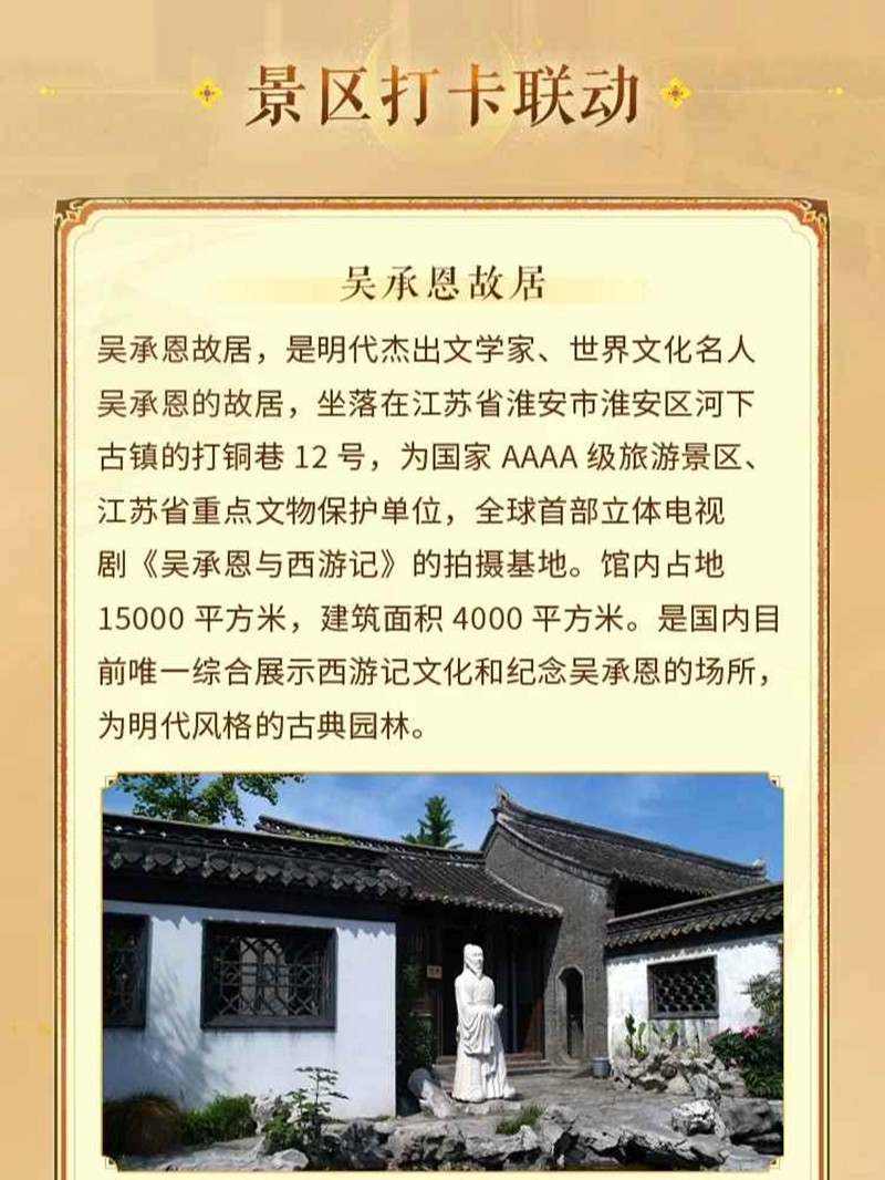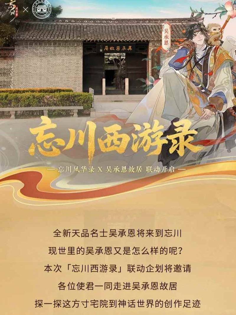 「忘川西游录」大型文旅联动企划——吴承恩故居站联动情报来啦!7月17日起,使君大人可通过参与【山河秘藏·西行】解锁游戏内吴承恩故居风景图鉴~7月19日-7月26日,使君大人前往故居线下打卡,就有机会领取相关周边哦~使君大人快来见证看一支笔如何点化顽石成猴王,一方砚台怎样倒映八十一难的传奇吧!