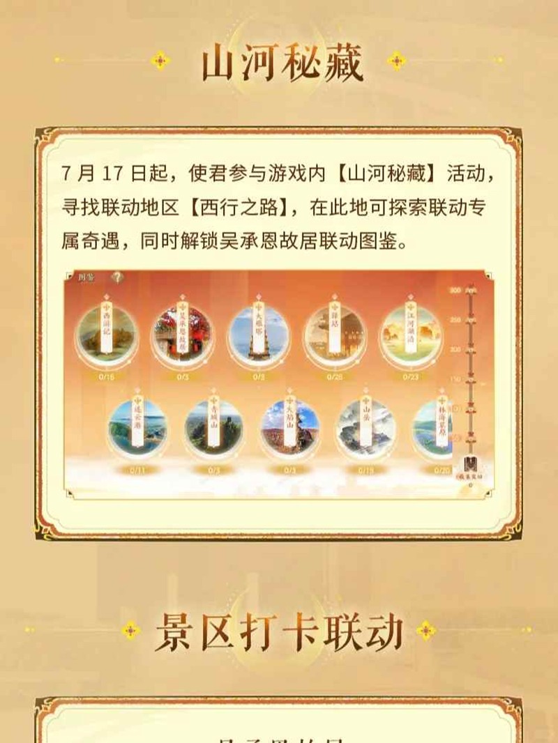 全新天品名士吴承恩将来到忘川,现世里的吴承恩又是怎么样的呢?本次「忘川西游录」联动企划将邀请各位使君一同走进吴承恩故居,探一探这方寸宅院到神话世界的创作足迹。7月17日起,使君大人可通过参与【山河秘藏·西行】解锁游戏内吴承恩故居风景图鉴~7月19日-7月26日,使君大人前往故居线下打卡,就有机会领取相关周边哦~