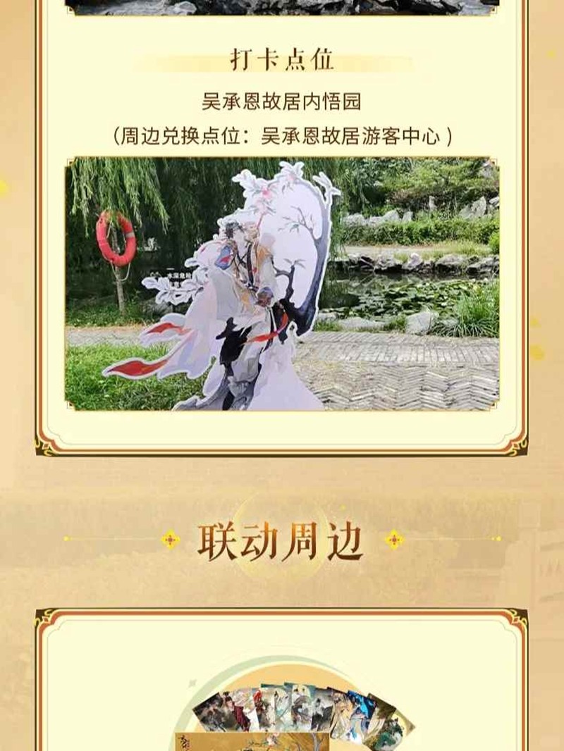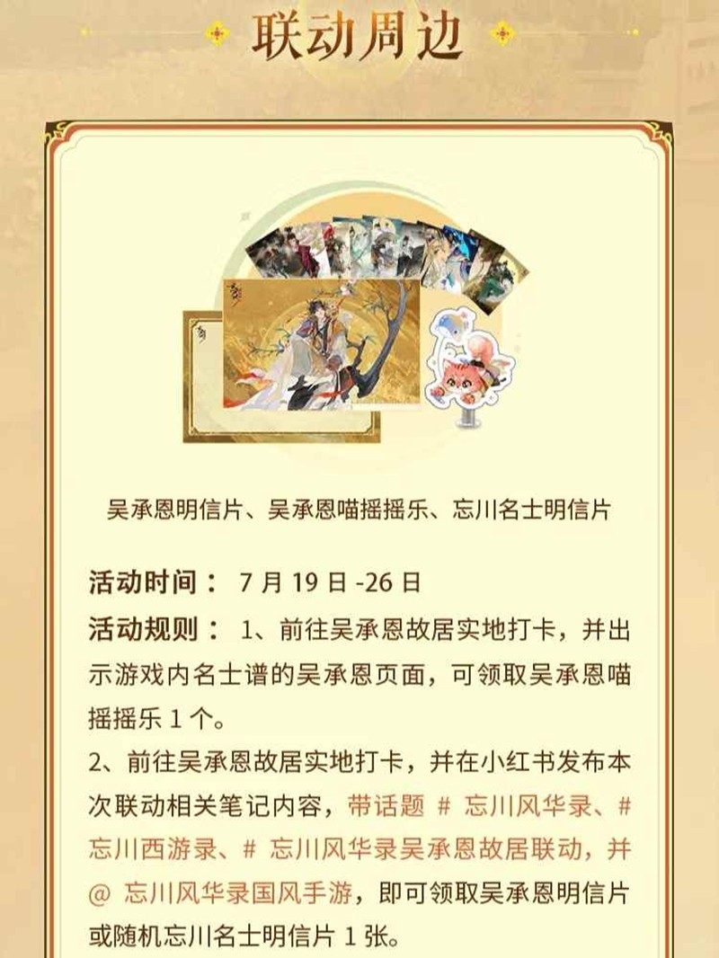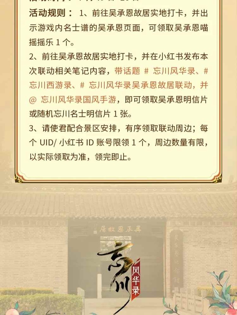 2、前往吴承恩故居实地打卡,并在小红书发布本次联动相关笔记内容,带话题 #忘川风华录、#忘川西游录、#忘川风华录吴承恩故居联动,并@ 忘川风华录国风手游,即可领取吴承恩明信片或随机忘川名士明信片1张。