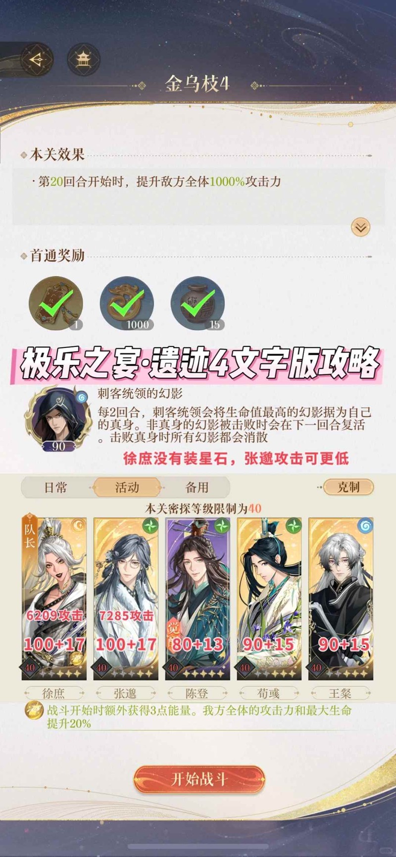 回合14: 【打4格能量刺客】登大,荀平a,粲平a,邈平a,庶大(如果14回合没结束战斗,有一个幻影先死了然后又满血复活了不要急着重开,2回合内把真身打死也会胜利)