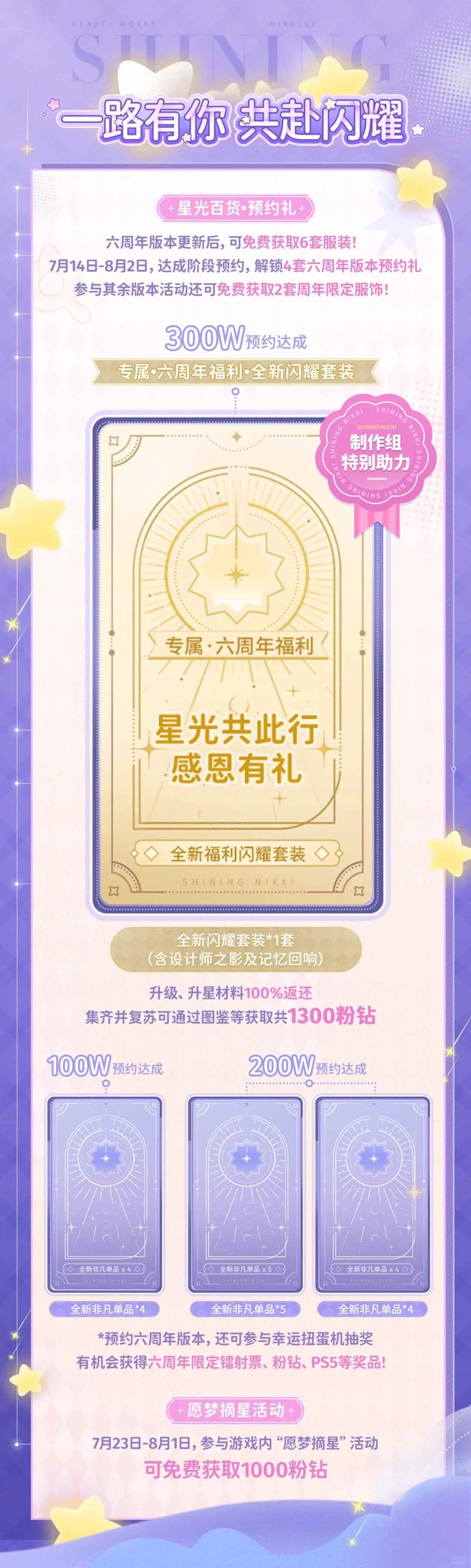 7月14日至8月2日,达成星光百货阶段预约,共可解锁【4套六周年版本预约礼】!