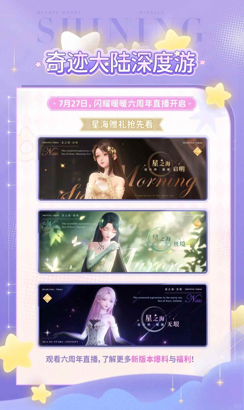 全新【星海赠礼】即将登场!观看六周年直播,解锁更多【新版本爆料与福利】!闪耀暖暖六周年全新版本即将上线,敬请期待!
