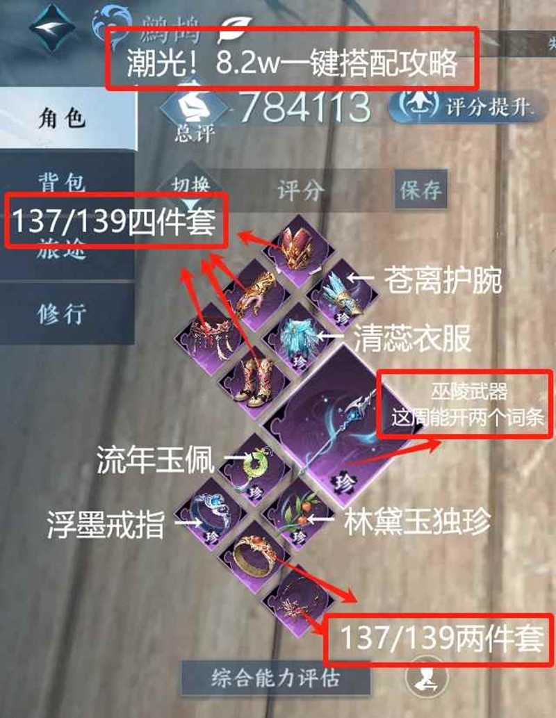 上身装备:苍离衣服/殷万敌头(记得加工气海词条)+清蕊衣服(加工气海词条)+137/139四件套