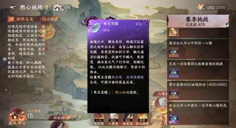 3.菜单-副本-【燃心画境】通关几次完成赛季挑战(领取 武器加工材料 寒玉雪髓),时间多的可以刷刷难度,难度高的箱子奖励丰厚,人机目前只能刷到难度3,组队可以刷难度四以上,开箱子建议开难度四以上