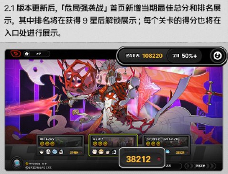 新增了「危局强袭战」首页当期最佳总分和排名的展示,其中排名将在获得9星后解锁展示;同时,每个关卡的得分也将在入口处进行展示。