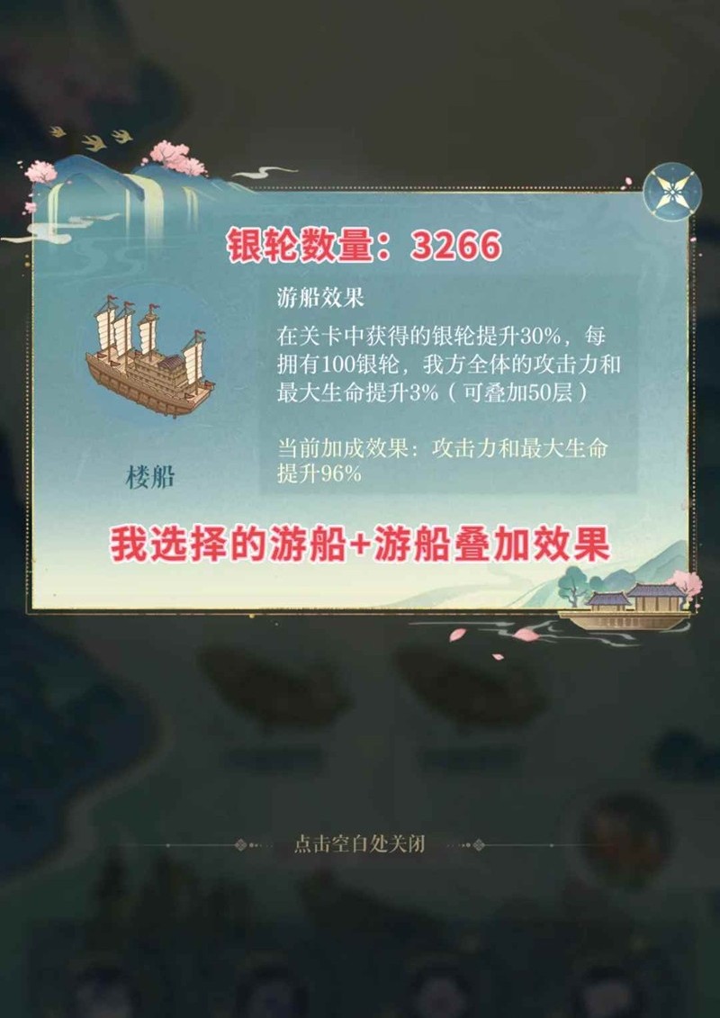 3. 选择【楼船】出发,尽量避开漂流瓶,运气不好可能会选到获得2000银轮,但是每走一步失去5%银轮,楼船本来就是靠银轮数量获得攻击力和生命加成的,尽量避免被附加这种效果