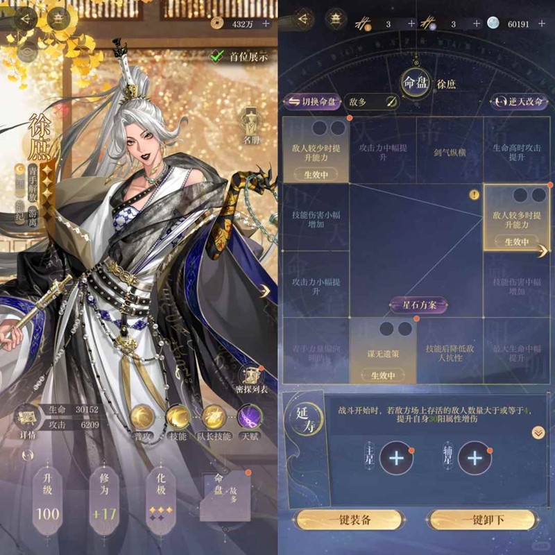 2. 夏侯惇可以替换成其他奶盾密探,周瑜可以替换成其他输出密探,选密探上场尽量满足徐庶的谋无命盘(4个神纪或者岐黄密探才能生效)