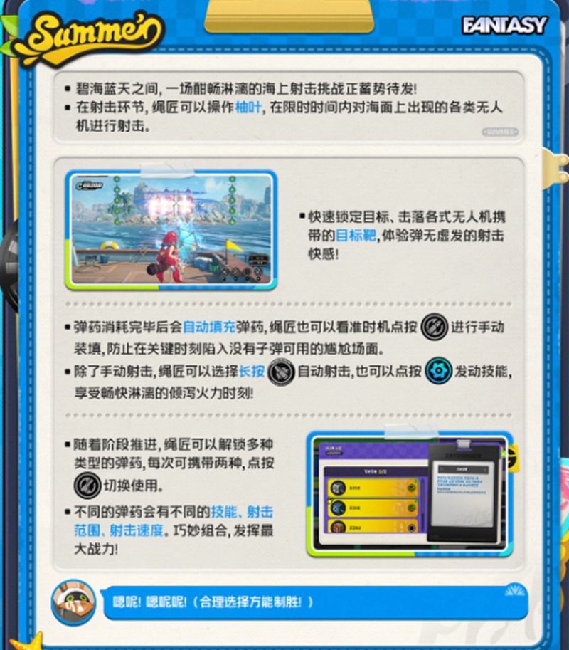 任务开始后,玩家需要操作柚叶使用水枪击落空中飞舞的无人机。不同型号的无人机拥有各自的飞行轨迹和特点,玩家需要合理切换子弹类型并采取对应的射击策略。这项玩法考验反应速度和战术选择,为活动增添了竞技乐趣。