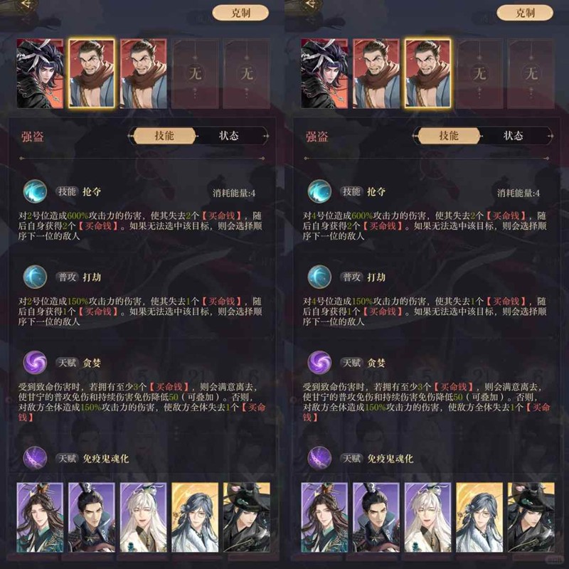 ③甘宁共有三条命,在第二条命即第二阶段会召唤两个【强盗】小兵,小兵普攻和技能都会夺取【买命钱】且小兵只打二、四号位,所以要把生命最高的两位放二、四号位