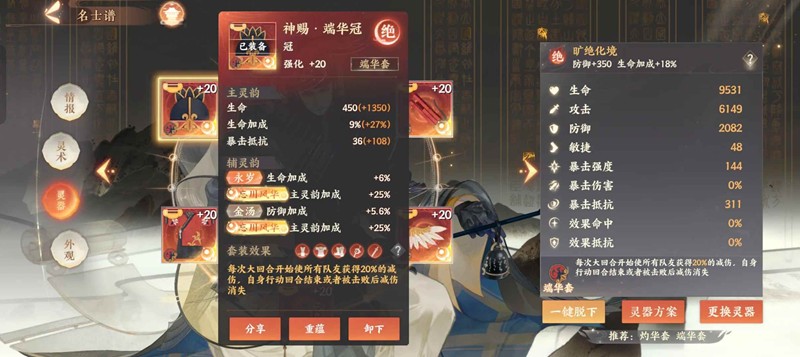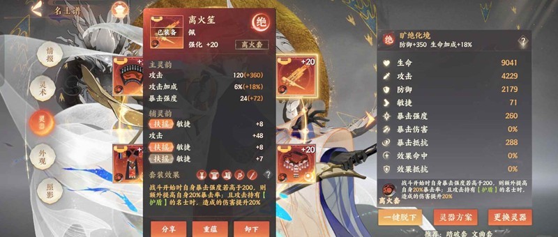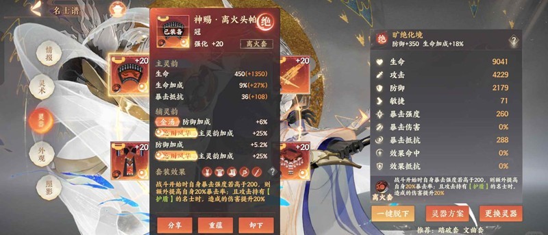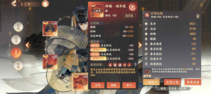 政斯天命中,嬴政李斯会对持有护盾的名士造成伤害分别提升30%和15%,所以装备选用离火最佳,配合天命,嬴政对护盾单位的增伤达到了15%+20%,离火衣帽属性选择爆抗,武器配饰选择暴强,鞋子选择攻击加成
