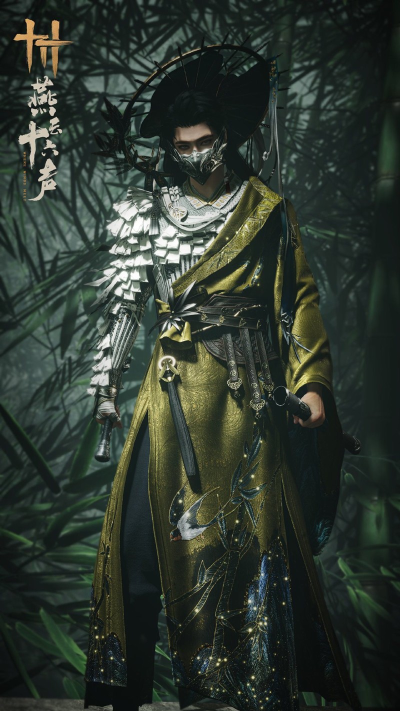 设计灵感:套装设计以宋代纸甲为灵感,男款背头披发,利落不凡;女款半扎马尾,洒脱不羁。服装融合了纸甲的层叠结构,腰带参考古代蹀躞带形制,凸显轮廓挺拔。