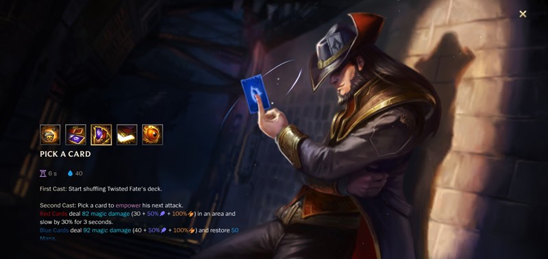 这是卡牌大师的核心技能,使用后会进入切牌状态。卡牌会按照红牌、黄牌、蓝牌的固定顺序循环切换。红牌造成范围伤害和减速效果,黄牌提供单体眩晕控制,蓝牌则能回复法力值并造成最高单体伤害。