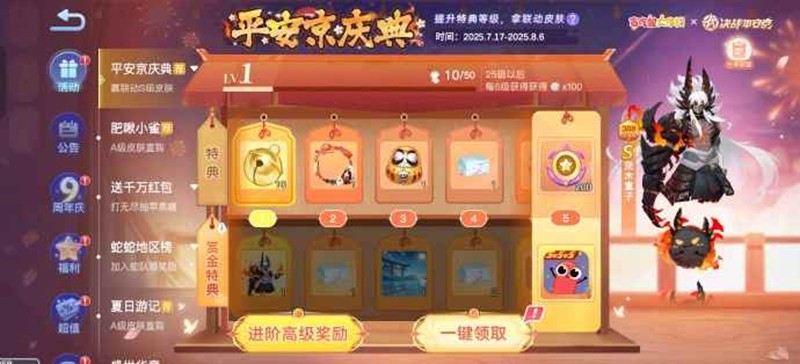 登录即领S级皮肤酒吞童子,更有平安京专属击杀、专属挂签累登即送,收集皮肤更可领取联动头像框!