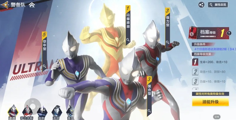当集齐某个奥特曼所有形态时,还能激活全局属性加成。以迪迦奥特曼为例,档案1级可增加全体奥特曼200生命和10攻击,后续等级还能解锁更多属性加成。