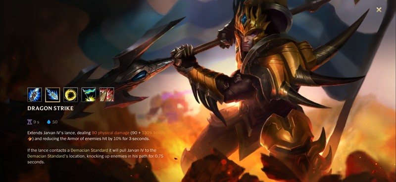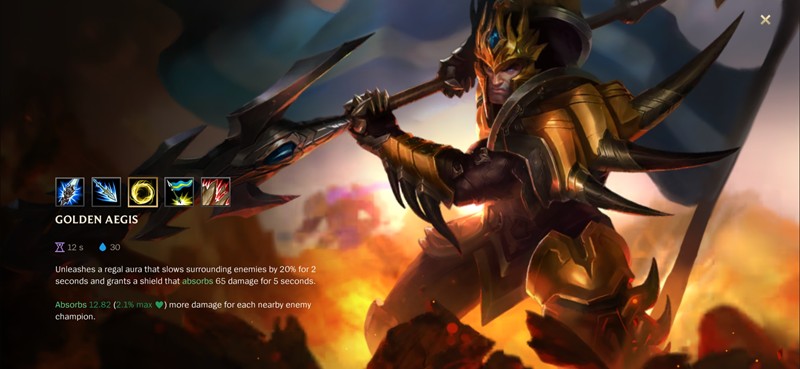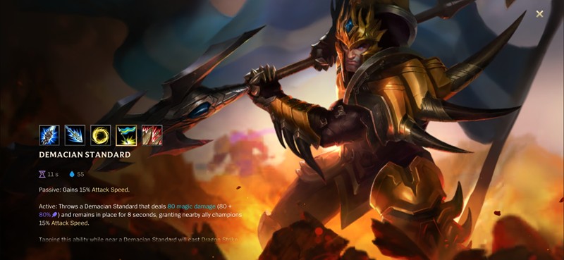 皇子投掷一柄德邦军旗到目标位置,对落点附近的敌人造成魔法伤害。军旗会为附近友军提供攻击速度加成,持续8秒。这个技能不仅能为团队提供增益,更是皇子连招的重要组成部分。