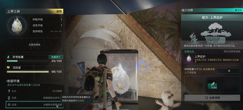 上界之卵激活后会赋予持有者"至上守护"技能效果。使用瞬间,玩家将被上界能量包裹,进入短暂的绝对免伤状态。在此期间,所有外界伤害都无法穿透护盾,但角色也无法进行攻击、移动等任何操作。这个技能在团队陷入危机时为队友争取宝贵时间,是扭转战局的关键道具。